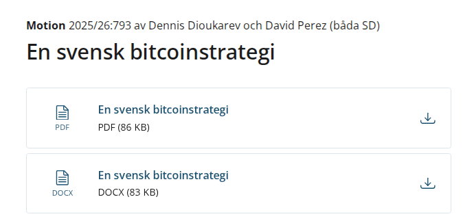 Nach der Präsentation von Jan3 im schwedischen Parlament, Abgeordnete @Dennisdioukarev und David Perez reichte einen Antrag auf eine strategische Bitcoin -Reserve ein und vor allem, um formell zu erklären, dass Schweden keine CBDC einführen wird. pic.twitter.com/t8mvfxlgki