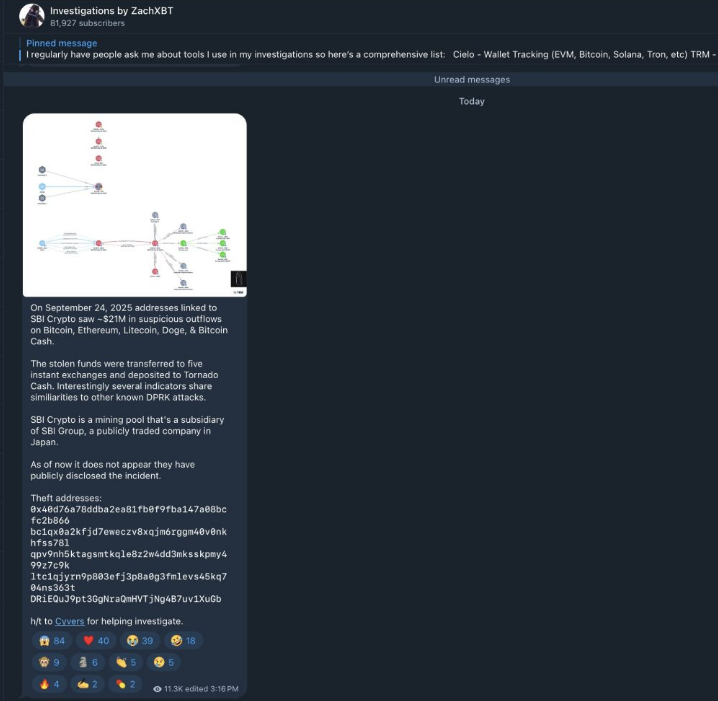 Berichte haben diese japanische Firma bekannt gegeben SBI Crypto Am 24. September 2025 wurden rund 21 Millionen US-Dollar von von Firmen verbundenen Brieftaschen abgesandt.
