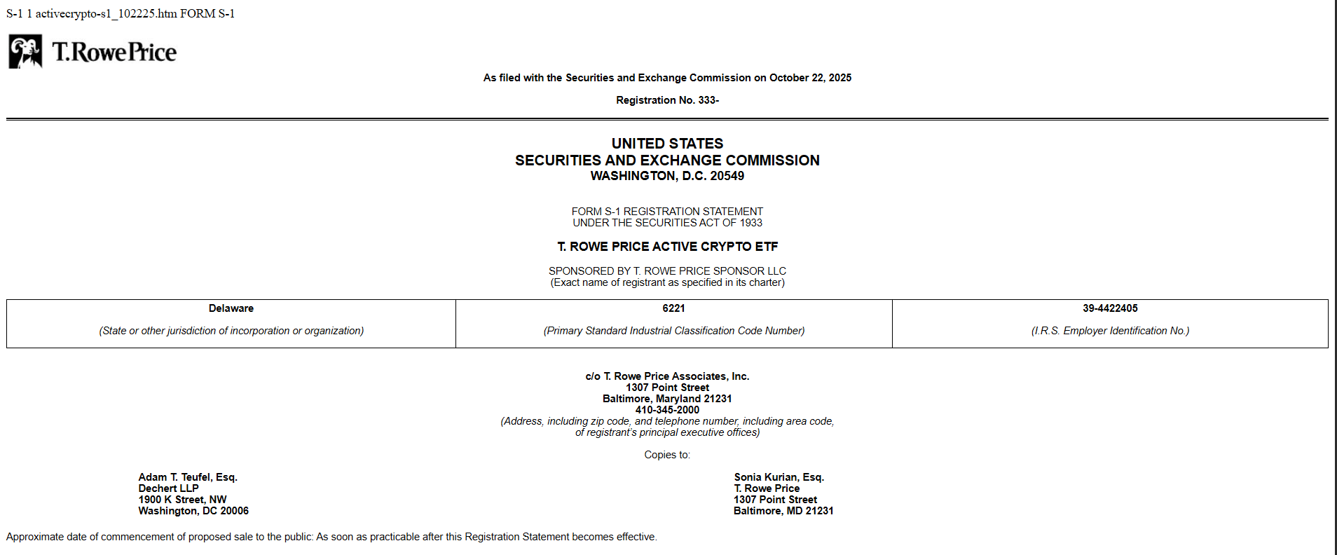 T. Rowe Price, der US-amerikanische Vermögensverwalter mit einem Vermögen von 1,8 Billionen US-Dollar, hat laut behördlichen Unterlagen und Marktberichten die Auflegung seines ersten börsengehandelten Kryptofonds beantragt. Mit dem Antrag wird die Registrierung eines aktiv verwalteten Produkts bei der US-Börsenaufsichtsbehörde Securities and Exchange Commission angestrebt, das Anlegern Zugang zu einem Korb digitaler Token statt einer einzelnen Münze verschaffen würde.