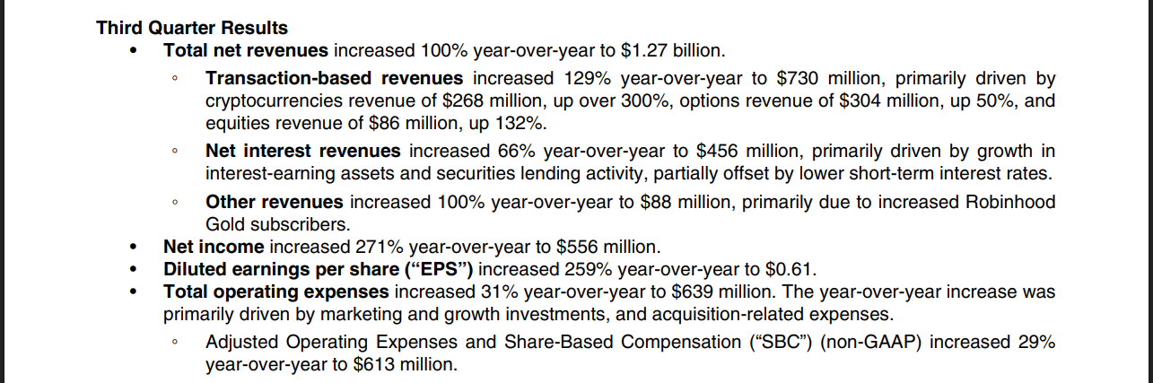 Derzeit ist die Verlagerung von Robinhood hin zu Krypto und verwandten Diensten in den Ergebnissen sichtbar. Das Unternehmen meldete große Zuwächse, und diese Zuwächse werden von Kunden getragen, die mit Kryptowährungen handeln, sowie von einigen kürzlich erworbenen oder gegründeten Unternehmen, die bereits erhebliche Umsätze erwirtschaften.