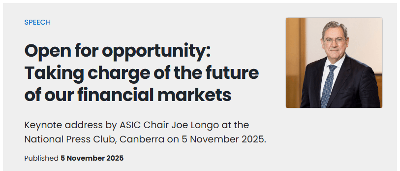 Laut a Rede In seiner Rede am 5. November forderte ASIC-Vorsitzender Joe Longo Regulierungsbehörden, Firmen und Investoren auf, jetzt zu handeln, und sagte, das Land müsse „die Chance nutzen, sonst werde man zurückgelassen“.