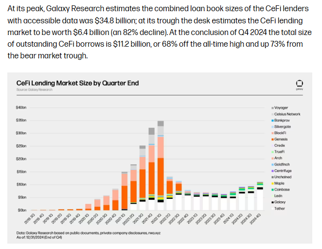 Entsprechend GalaxienforschungIm vierten Quartal 2024 belief sich der Gesamtmarkt für Kryptokredite auf rund 36,5 Milliarden US-Dollar, ein Rückgang gegenüber dem Höchststand von 64,4 Milliarden US-Dollar im vierten Quartal 2021. Dieser Rückgang spiegelt die Folgen früherer Plattformausfälle und Insolvenzen wider, die sowohl Angebot als auch Nachfrage beeinträchtigten.