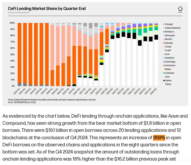 DeFi-Kreditaufnahme hat erholt stark von den Tiefstständen des Abschwungs 2022–2023. Die offenen Kredite auf dezentralen Plattformen stiegen von rund 1,8 Milliarden US-Dollar im Tiefpunkt auf 19 Milliarden US-Dollar bis Ende 2024, was einem Anstieg von 959 % in diesem Zeitraum entspricht. Dies zeigt, dass viele Benutzer mit der Schrumpfung zentralisierter Optionen wieder auf On-Chain-Lösungen umgestiegen sind.